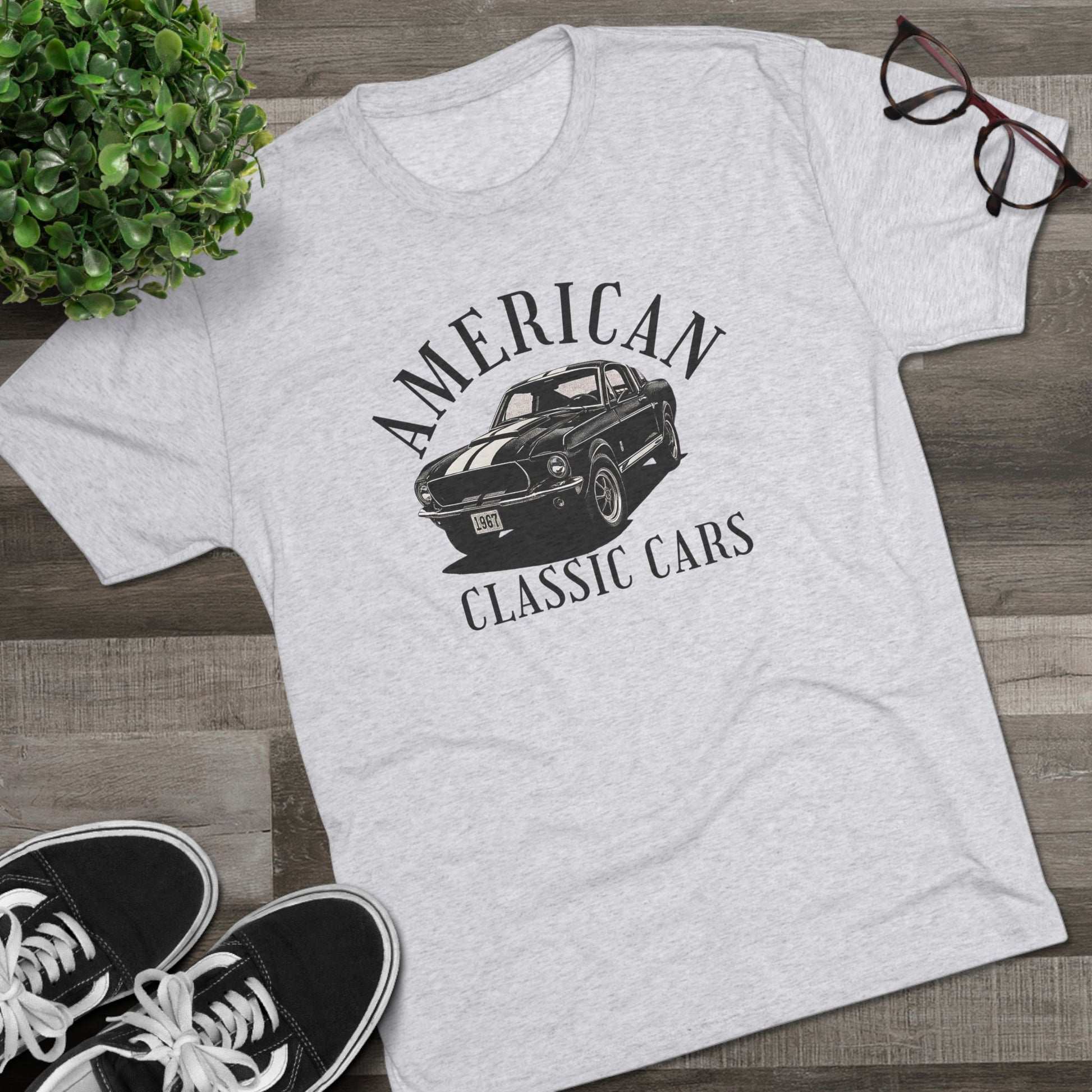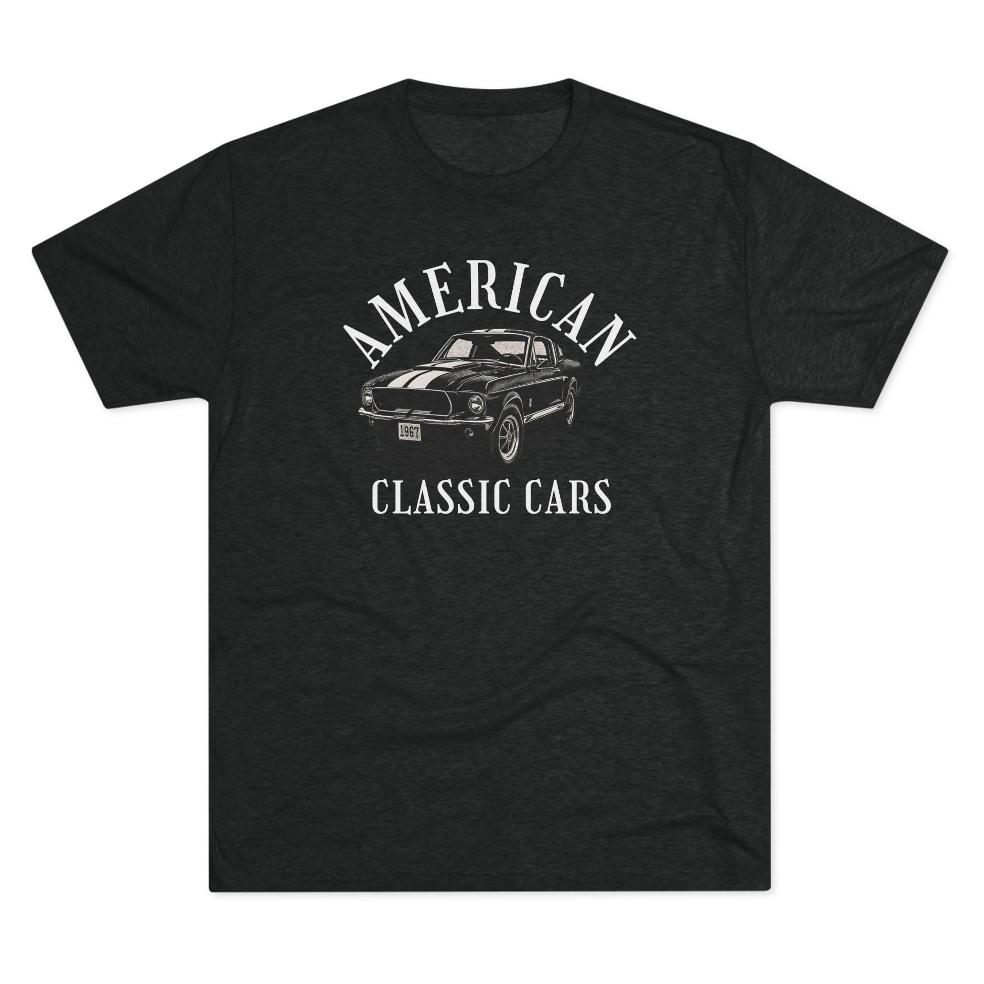 A classic American Classic Cars mustang design on a soft and durable tri-blend crew tee.